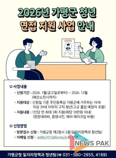뉴스팍 배상미 기자 | 가평군이 관내 청년들을 대상으로 구직 과정에서 발생하는 경제적 부담을 덜어주기 위해 ‘청년 면접 지원사업’을 추진한다.