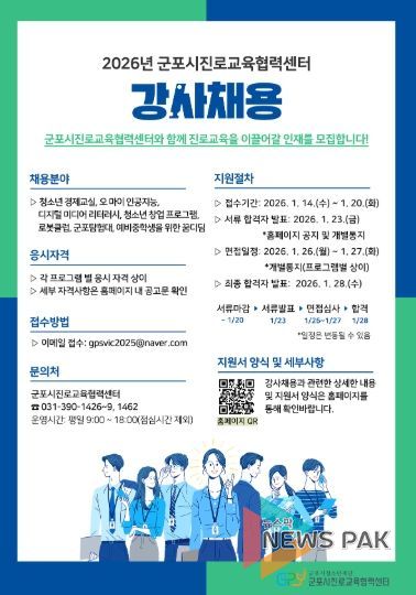 뉴스팍 배상미 기자 | (재)군포시청소년재단 군포시진로교육협력센터는 관내 청소년의 진로 탐색과 진로 역량 강화를 위해 '2026년 군포시진로교육협력센터 강사'를 채용한다고 밝혔다.