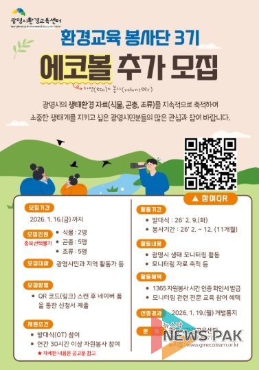 뉴스팍 배상미 기자 | 광명시는 지역 생태환경을 직접 조사하고 기록할 시민 참여형 모니터링 봉사단 ‘에코볼 3기’를 오는 16일까지 추가 모집한다.