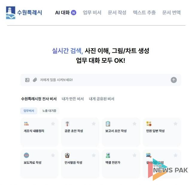 뉴스팍 배상미 기자 | 수원특례시가 생성형 인공지능(AI)을 행정 전반에 활용하기 위해 12일 공직자를 대상으로 ‘수원 인공지능(AI) 업무 비서’ 서비스를 개시했다.