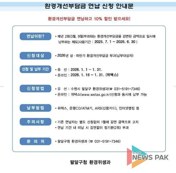 뉴스팍 배상미 기자 | 수원시 팔달구는 환경개선부담금 납부 대상자를 대상으로 1월 31일까지 환경개선부담금 연납 신청을 받는다.
