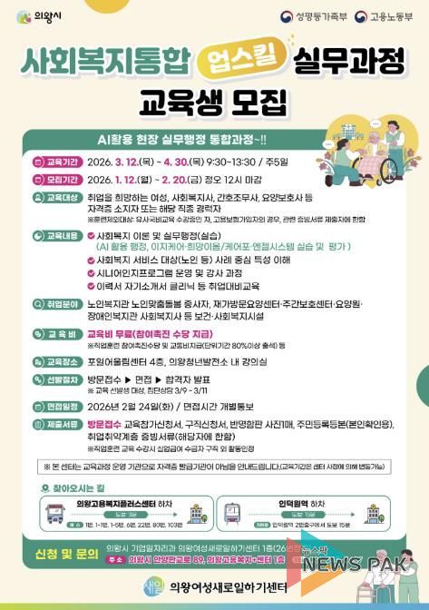 뉴스팍 배상미 기자 | 의왕시 여성새로일하기센터가 사회복지 분야 취업을 희망하는 여성을 위한 『사회복지 통합 업스킬 실무과정』교육생을 2월 20일까지 모집한다.