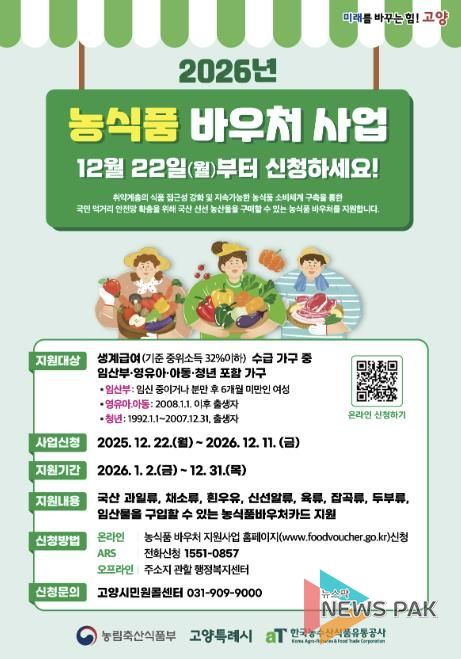 뉴스팍 배상미 기자 | 고양특례시는 올해부터 지역 내 취약계층의 균형 잡힌 식생활을 지원하고, 농식품 소비 촉진을 돕기 위해 ‘농식품 바우처 사업'을 확대 시행한다고 13일 밝혔다.