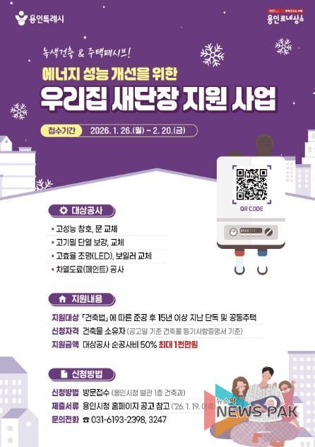 뉴스팍 배상미 기자 | 용인특례시가 오는 26일부터 2월 20일까지 노후주택 에너지 효율 개선 지원 사업인 ‘우리집 새단장 지원사업’ 신청을 받는다고 16일 밝혔다.