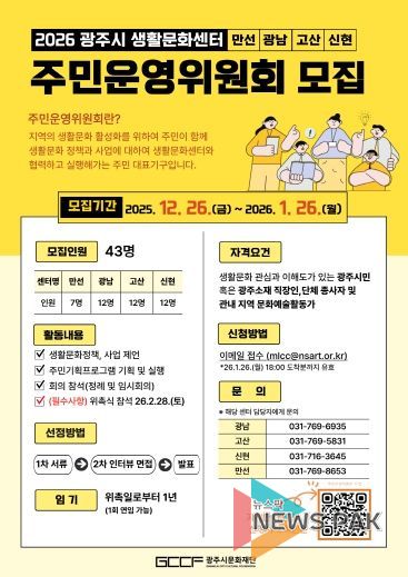 뉴스팍 이화형 기자 | (재)광주시문화재단은 광주시 생활문화센터(만선·광남·고산·신현)에서 2026년에 활동할 주민운영위원회 위원을 통합 공개 모집한다고 밝혔다.