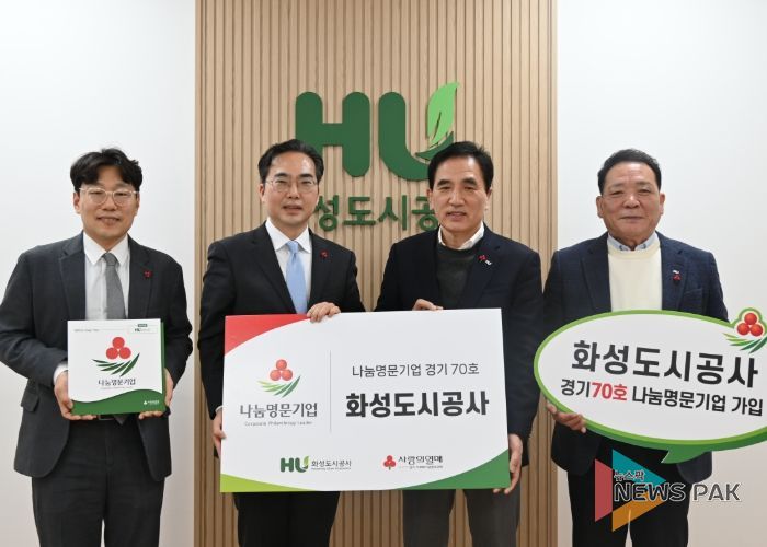 뉴스팍 류은정 기자 | 화성도시공사가 사랑의열매 고액 기부 기업 모임인 ‘나눔명문기업’ 경기 70호로 이름을 올렸다. 단발성 기부가 아닌, 노사가 합동으로 오랜 시간 이어온 지역사회 나눔의 기록이 하나의 결실로 이어졌다는 점에서 의미가 남다르다.