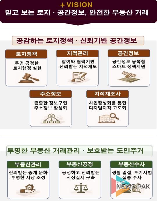 추진계획은 ▲투명하고 균형 잡힌 제도 운영으로 신뢰받는 토지행정 실현 ▲참여와 협력을 통한 신뢰받는 지적제도 정착 ▲공간정보 융·복합을 통한 스마트한 정책 지원 ▲촘촘한 주소정보 구현 및 주소정보 활성화 추진 ▲사업활성화를 통한 디지털지적 고도화 ▲신뢰받는 중개 문화와 투명한 부동산 시장 조성 ▲공정하고 신뢰받는 시장질서 구축 ▲생활밀접, 투기사범 집중수사 등 8대 전략을 바탕으로 한 92개 세부 이행과제로 구성됐다.