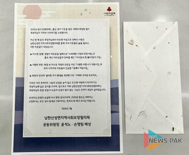 뉴스팍 이화형 기자 | 광주시 남한산성면 지역사회보장협의체는 2026년 병오년(丙午年) 새해를 맞아 지난 한 해 동안 지역 내 어려운 이웃을 위해 나눔을 실천해 온 후원자들에게 감사의 마음을 담은 서한문을 발송했다고 21일 밝혔다.
