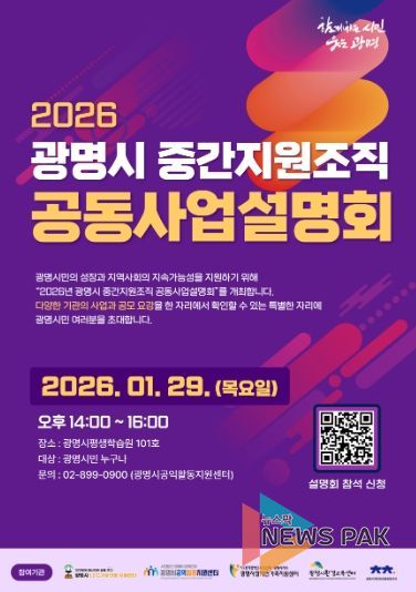 광명시공익활동지원센터는 오는 29일 오후 2시 광명시 평생학습원 101호에서 ‘2026 광명시 중간지원조직 공동사업설명회’를 개최한다.