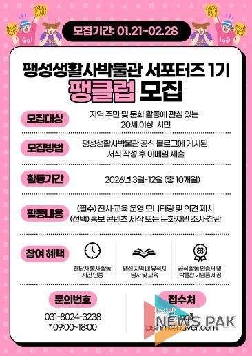 뉴스팍 이소율 기자 | 팽성생활사박물관은 서포터즈 1기 ‘팽클럽’에 참여할 지역 주민을 비롯해 문화 활동에 관심 있는 시민(20세 이상)을 오는 2월 28일까지 모집한다고 밝혔다.