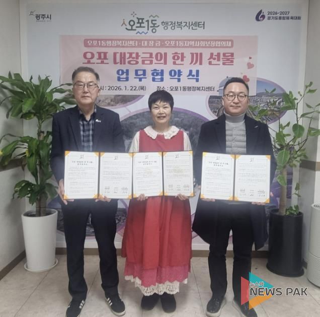 뉴스팍 이화형 기자 | 광주시 오포1동은 지난 22일 지역 내 음식점 대장금, 오포1동 지역사회보장협의체와 함께 저소득 취약계층의 식생활 지원을 위한 ‘오포 대장금의 한 끼 선물’ 업무협약을 체결했다.