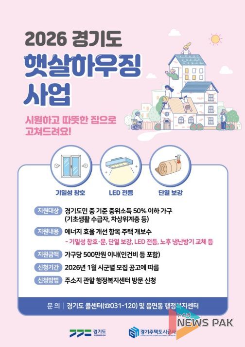 뉴스팍 배상미 기자 | 경기도가 난방비 및 전기료 등 주거비 부담을 덜어주기 위해 2026년 햇살하우징 사업을 추진한다.