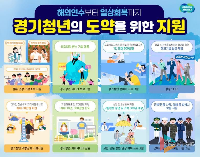 뉴스팍 배상미 기자 | 경기도가 올해 청년들을 위한 건강검진비와 예방접종비를 최대 20만 원까지 지원한다. 청년들에게 해외연수 기회를 제공하는 청년사다리, 해외취업을 위한 경청스타즈, 진로설계를 지원하는 갭이어 사업, 만 24세 경기도 청년에게 연간 최대 100만 원, 분기별 지역화폐를 지원하는 경기도 청년기본소득은 올해도 계속된다. 청년들의 경제적 부담을 덜어주기 위한 어학이나 자격시험 응시료 지원, 금융지원뿐 아니라, 고립은둔청년 지원, 군복무 청년 상해보험 가입도 있다. 청년들의 현재와 미래를 위한 정책이다.