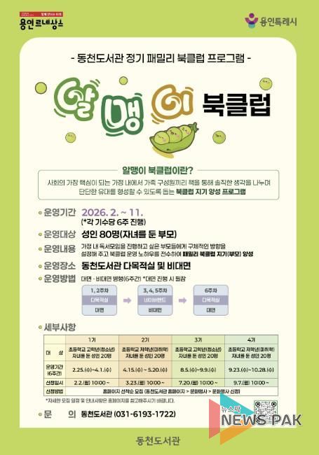 뉴스팍 배상미 기자 | 용인특례시 동천도서관은 오는 2월 2일부터 선착순으로 ‘알맹이 북클럽’ 참가자를 모집한다고 26일 밝혔다.