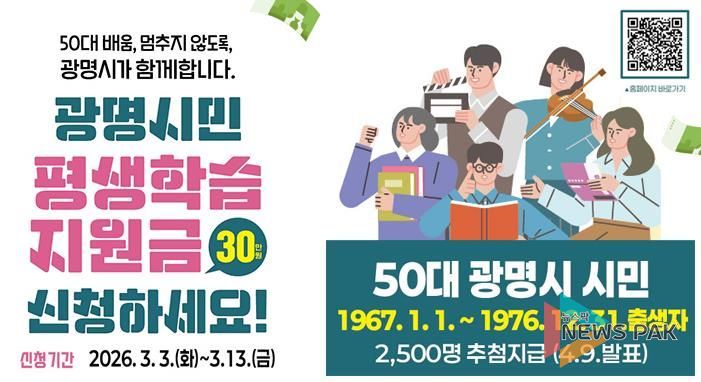 뉴스팍 배상미 기자 | 광명시가 50대 중장년 시민의 배움 기본권 보장을 위해 올해도 평생학습지원금 지원을 이어간다.
