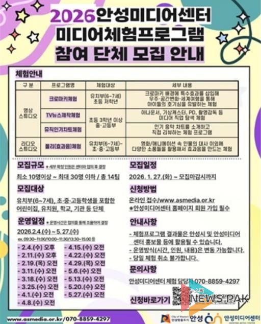 뉴스팍 배상미 기자 | 안성미디어센터는 지역 어린이와 청소년이 미디어를 쉽고 재미있게 접할 수 있도록 ‘2026년 미디어체험프로그램’에 참여할 관내 어린이집, 유치원, 학교 등 단체를 모집한다고 밝혔다.