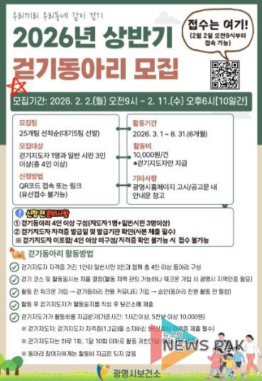 뉴스팍 배상미 기자 | 광명시가 시민의 건강 증진과 일상 속 걷기 문화 확산을 위해 오는 2월 2일부터 11일까지 ‘2026년 상반기 걷기동아리’ 참가팀을 모집한다.