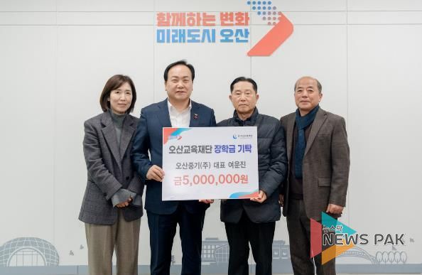 이권재 오산시장은 “지역사회를 위해 꾸준히 나눔을 실천해 주고 계신 여운진 대표님께 진심으로 감사드린다”며 “기탁해 주신 장학금은 오산 학생들이 꿈과 재능을 마음껏 펼칠 수 있도록 소중히 활용하겠다”고 밝혔다.