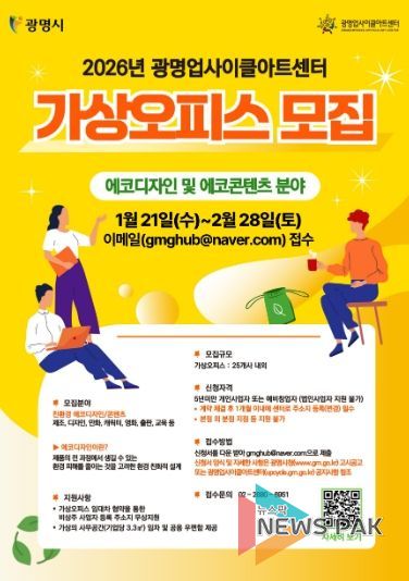 뉴스팍 배상미 기자 | 광명시 광명업사이클아트센터는 오는 2월 28일까지 ‘2026년 상반기 가상오피스 지원사업’ 입주 기업을 모집한다.