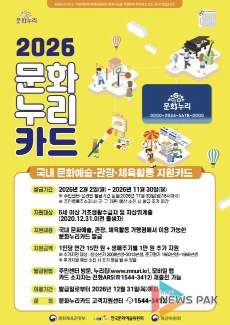 시는 경제적 여건으로 문화생활을 즐기기 어려운 6세 이상 기초생활수급자와 차상위계층에게 15만 원의 통합문화이용권(문화누리카드)을 지원한다고 28일 밝혔다.