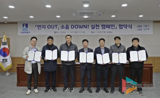 수원시 권선구는 지난 1월 27일 구청 상황실에서 관내 대형공사장 6개소와 비산먼지 및 소음 저감을 위한 ‘먼지 OUT, 소음 DOWN! 실천 캠페인’ 자율 실천 협약식을 개최했다.