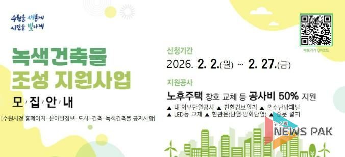 뉴스팍 배상미 기자 | 수원특례시가 2월 2일부터 27일까지 ‘2026년 녹색건축물 조성 지원사업’ 신청을 받는다.