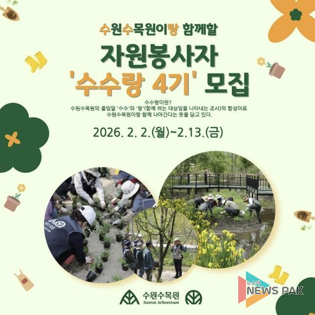 뉴스팍 배상미 기자 | 수원특례시는 수원수목원(일월·영흥수목원) 운영을 함께할 자원봉사자 ‘수수랑’ 4기 60명(일반 40명, 해설 20명)을 2월 2일부터 13일까지 모집한다.