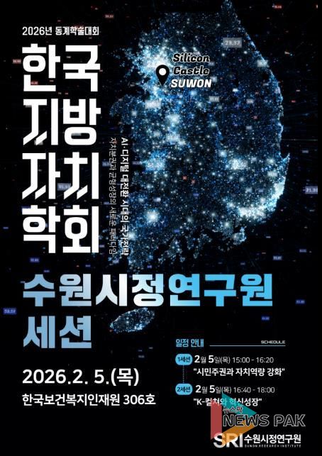 뉴스팍 배상미 기자 | 수원시정연구원은 오는 2월 5일(목) 충북 청주 오송 한국보건복지인재원에서 열리는 2026년 한국지방자치학회 동계학술대회에서 수원시의 대표 혁신 정책과 미래 성장 전략을 주제로 한 세션을 개최한다고 2월 2일 밝혔다.