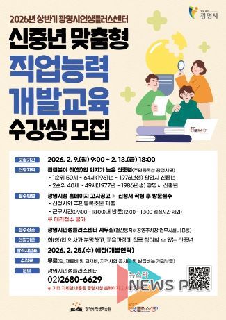 뉴스팍 배상미 기자 | 광명시 인생플러스센터는 신중년의 취업 경쟁력을 높이고 성공적인 인생 재도약을 지원하기 위해 오는 13일까지 ‘2026년 상반기 신중년 맞춤형 직업능력개발교육과정’ 수강생을 모집한다.