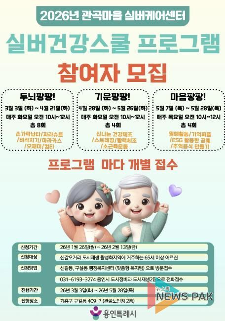 뉴스팍 배상미 기자 | 용인특례시는 ‘관곡마을 실버케어센터 실버건강 프로그램’ 참가자를 13일까지 모집한다.