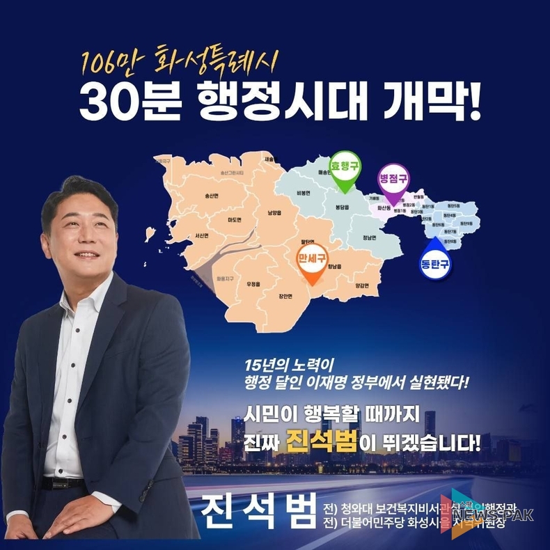 뉴스팍 배상미 기자 | 진석범 화성특례시장 출마예정자는 2월 1일, 화성특례시의 만세구·효행구·병점구·동탄구 4개 구청 체제 공식 출범과 관련해 “화성 시민의 오랜 염원이었던 4개 구청 체제 출범을 진심으로 환영한다”며, “이번 변화가 행정편의가 아닌 시민편의로 운영돼야 한다”고 밝혔다.