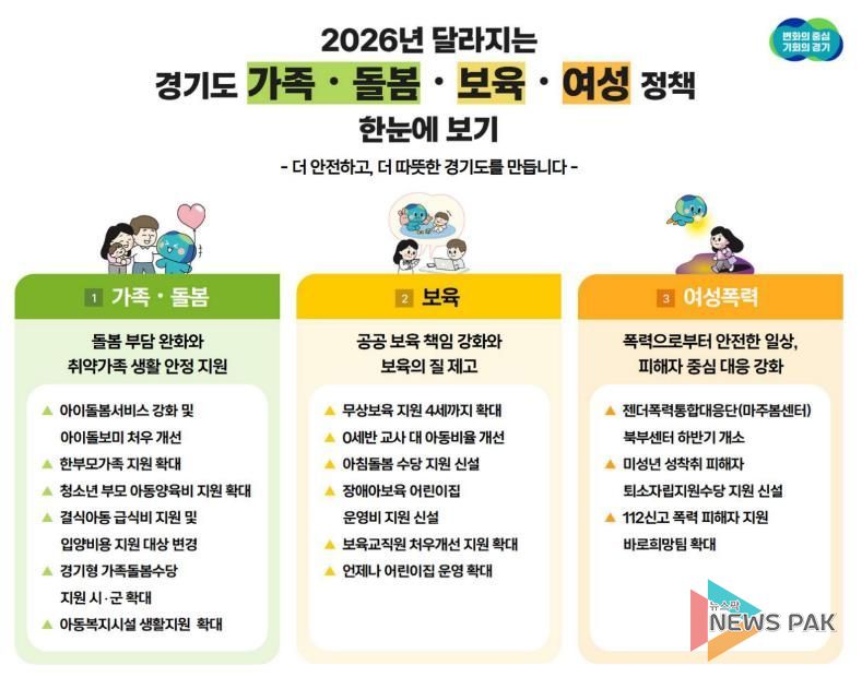 뉴스팍 배상미 기자 | 경기도는 올해 여성폭력, 가족‧돌봄, 보육 분야에 걸쳐 총 16개 제도를 개선하거나 신규 도입한다고 4일 밝혔다.