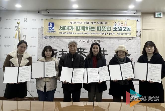 뉴스팍 배상미 기자 | 수원시 장안구 조원2동은 지난 3일, 행정복지센터 2층 소회의실에서 세대 간 교류 활성화 및 공동체 의식 함양을 위한 경로당–어린이집 결연식을 개최했다.