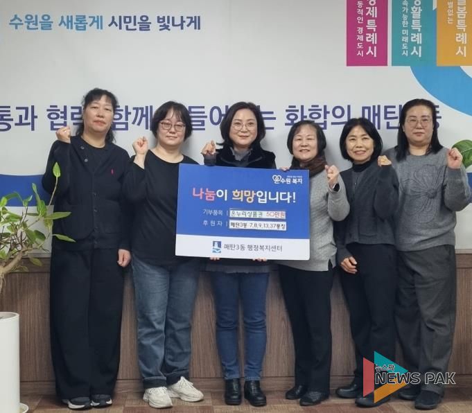 뉴스팍 배상미 기자 | 수원시 영통구 매탄3동은 지난 3일 매탄3동 7, 8, 9, 13, 37통장 일동이 설 명절을 맞아 관내 어려운 이웃들에게 온누리상품권 50만원을 기부했다고 밝혔다.