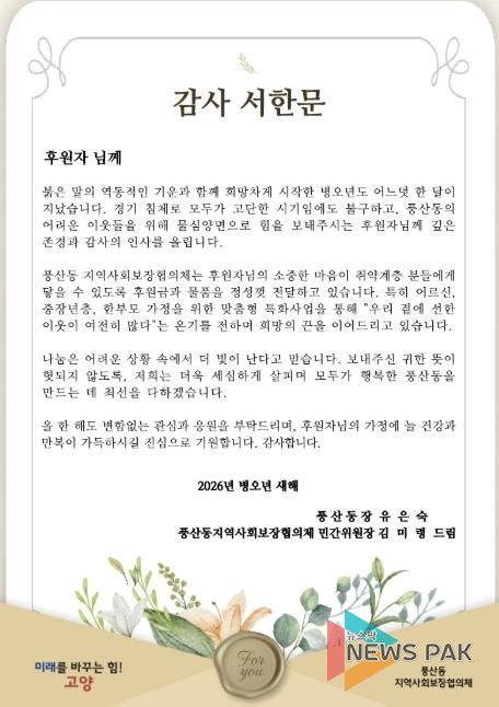 뉴스팍 배상미 기자 | 고양특례시 일산동구 풍산동 지역사회보장협의체는 설명절을 앞둔 지난 3일 지난해 지역사회의 어려운 이웃을 위해 따뜻한 나눔을 실천한 후원자들에게 감사의 마음을 담은 서한문을 발송했다.