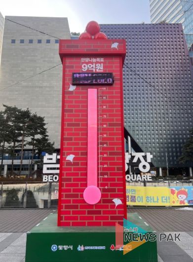 뉴스팍 배상미 기자 | 안양시는 범계역 광장에 설치된 ‘사랑의 온도탑’이 올해도 100도를 넘겼다고 4일 밝혔다. 지난해 12월 1일부터 올해 1월 31일까지 진행된 모금 결과, 시민과 기업의 참여로 온도는 최종 101도를 기록했다.