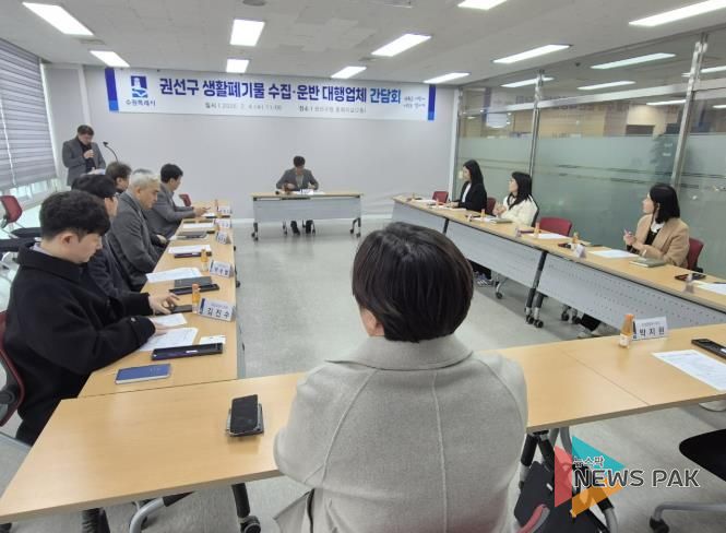 뉴스팍 배상미 기자 | 권선구 환경위생과는 최일선에서 일하는 생활폐기물 수집·운반 대행업체를 격려하고 지난달 21일, 환경관리원 반장 간담회에서 건의된 사항 등을 논의하고자 ‘권선구 생활폐기물 수집·운반 대행업체 간담회’를 2026년 2월 4일 오전 11시에 개최했다.