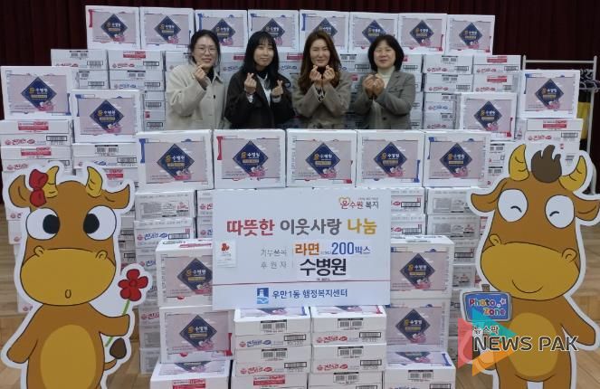 뉴스팍 배상미 기자 | 수병원은 지난 4일, 설 명절을 맞아 어려운 이웃들을 위해 라면 200박스를 우만1동 행정복지센터에 기부하며 이웃사랑을 실천했다.