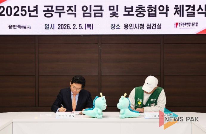 뉴스팍 배상미 기자 | 용인특례시는 5일 시청 접견실에서 시 소속 공무직 근로자를 대표하는 전국민주연합노동조합 용인지부와 ‘2025년 공무직 임금·보충 협약’을 체결했다고 밝혔다.