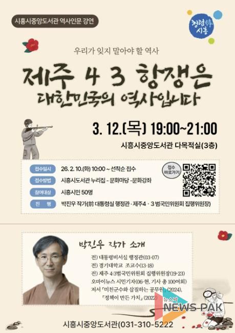 뉴스팍 배상미 기자 | 시흥시중앙도서관은 오는 3월 12일 오후 7시, 시민을 대상으로 역사 인문 강연 ‘제주 4ㆍ3항쟁은 대한민국의 역사입니다’를 운영한다.
