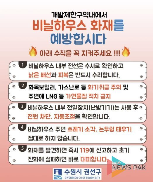 권선구 관계자는 “비닐하우스 화재는 작은 부주의로도 큰 피해로 이어질 수 있는 만큼, 기본적인 안전수칙 실천이 무엇보다 중요하다”며 “앞으로도 개발제한구역 내 화재 취약 시설을 대상으로 지속적인 점검과 홍보 활동을 이어가겠다”라고 밝혔다.