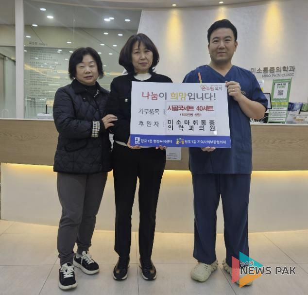 김영희 망포1동장은 “지속적인 관심과 나눔을 실천해 주시는 미소마취통증의학과의원에 깊이 감사드린다”며 “기부해 주신 따뜻한 마음이 이웃들의 몸과 마음 모두에 큰 힘이 될 것”이라고 감사의 뜻을 밝혔다.