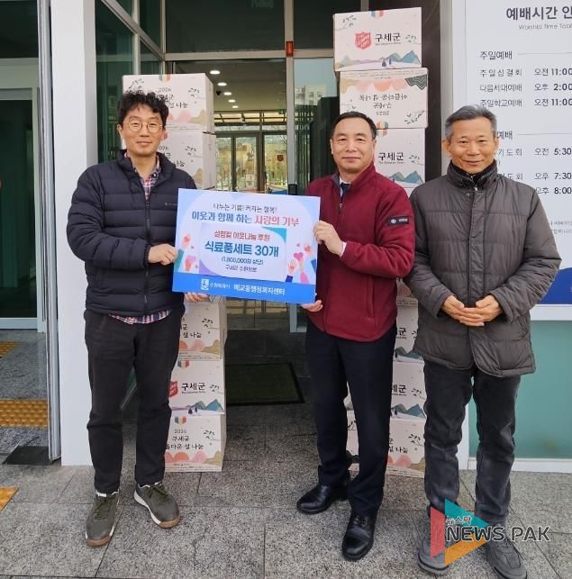 뉴스팍 배상미 기자 | 지난 5일, 구세군수원영문에서 수원시 팔달구 매교동에 설 명절을 앞두고 풍성한 명절 분위기를 조성하여 기쁨을 나누고자 관내 어려운 이웃들에게 180만원 상당의 식료품 선물 세트 30박스를 후원했다.