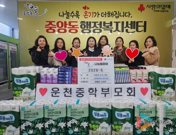 백경희 중앙동장은 “지역사회를 위해 이웃사랑을 실천해 주신 운천중학교 학부모회에 깊이 감사드린다”며 “기탁해 주신 물품은 정성 어린 마음을 담아 도움이 필요한 어르신들께 소중히 전달하겠다”고 밝혔다.