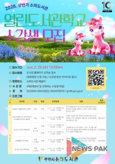 뉴스팍 배상미 기자 | 광명시 소하도서관이 ‘2026년 상반기 열린도서관학교’ 수강생을 모집한다.