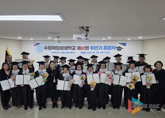 뉴스팍 배상미 기자 | 수원제일평생학교는 2월 5일 오후 제61회 하반기 학력인정 졸업식을 진행했다. 졸업식은 교내 난타 동아리의 축하 공연으로 시작됐으며, 경기도교육청·수원교육지원청·수원시청 관계자들이 참석해 자리를 함께했다.