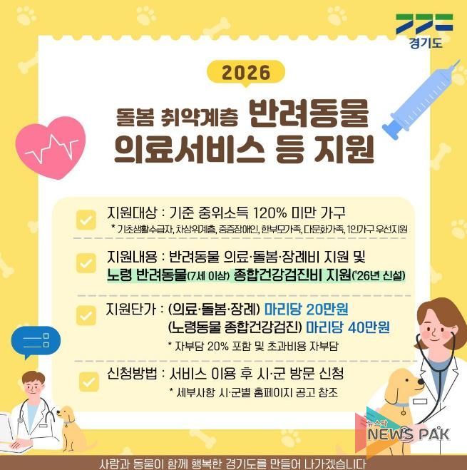 뉴스팍 배상미 기자 | 경기도가 올해부터 기초생활수급자나 중증장애인 등 사회적 배려계층이 키우는 7세 이상 노령 반려동물에 대한 종합건강검진비를 지원한다.