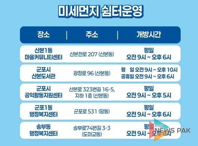 현재 운영 중인 미세먼지 쉼터는 ▲산본1동 마을커뮤니티센터 ▲산본도서관 ▲군포시 공익활동지원센터 ▲군포1동 행정복지센터 ▲송부동 행정복지센터 등 총 5개소이며, 이용 시간은 평일 오전 9시부터 오후 6시까지다. 다만, 시설별 세부 운영 시간은 각 쉼터에 문의하면 된다.