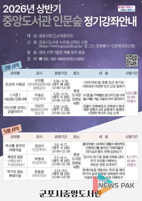 뉴스팍 배상미 기자 | 군포시중앙도서관은 시민의 인문학적 소양을 함양하고 공동체적 성찰의 기회를 확대하고자 ‘중앙도서관 인문숲’ 상반기 강좌를 운영한다.