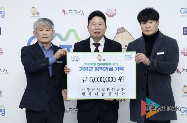 뉴스팍 배상미 기자 | 가평군 교육 발전을 향한 군민들의 관심이 이어지고 있는 가운데, 가평군시설관리공단이 9일 군청을 방문해 장학기금 500만원을 전달했다.